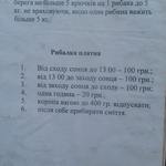 Півдня 100 грн, за світловий день 200 грн, за ніч доплата ще 100 грн. 5 гачків на одного рибалку, норма вилову 5 кг.