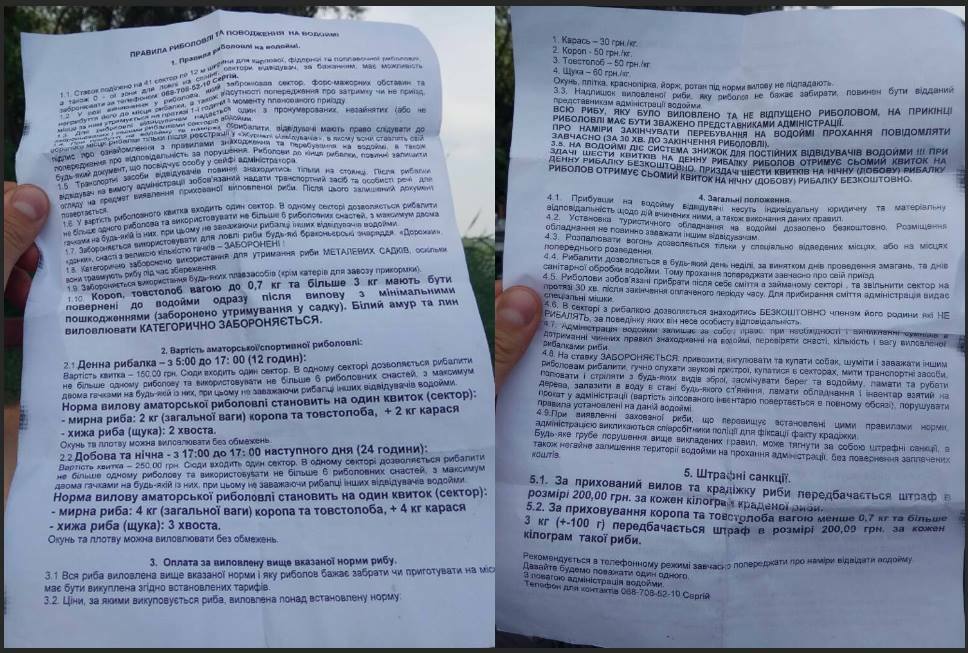 Норма вилову 2 кг( карп або товстолоб). Карп до 700 г і після 3 кг відпускається. Амур і Лин без обговорень зразу відпускати. Інша риба без обмежень. Нічна рибалка з 17-00. має нормау 4 кг далі доплачуєш за кожен кілограм. Машину залишаєш на стоянці. Ніби є тачка. Можна взяти, щоб завести снасті в сектор. Здається максимум 4 снасті,до 2-х гачків. Власник залишає право за собою перевірити машину і особисті речі. Крім того може сказати залишити якісь документи, а при виїзді віддасть. Короче, умови, як тюрмі, але риба ніби є.
