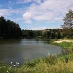 Рослинність водойми: дивлячись де сідати, сам став проточний, розташований в лісі. Є столики, лавочки в одному місці, на базі відпочинку. Берег є високий, є низький. Дерева, тінь…