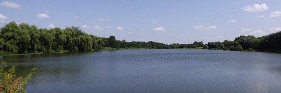 Рослинність водойми: став оточений лісом.