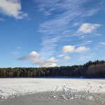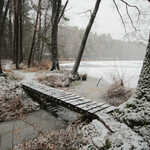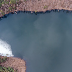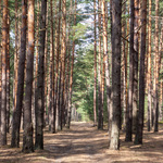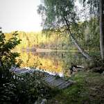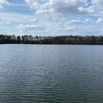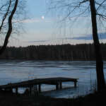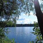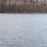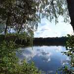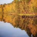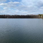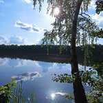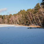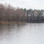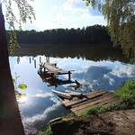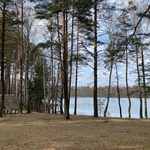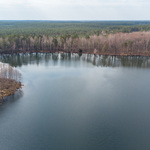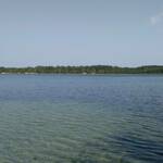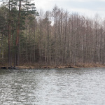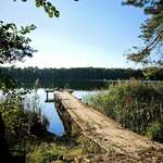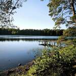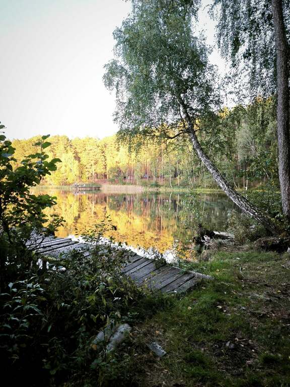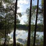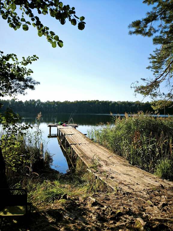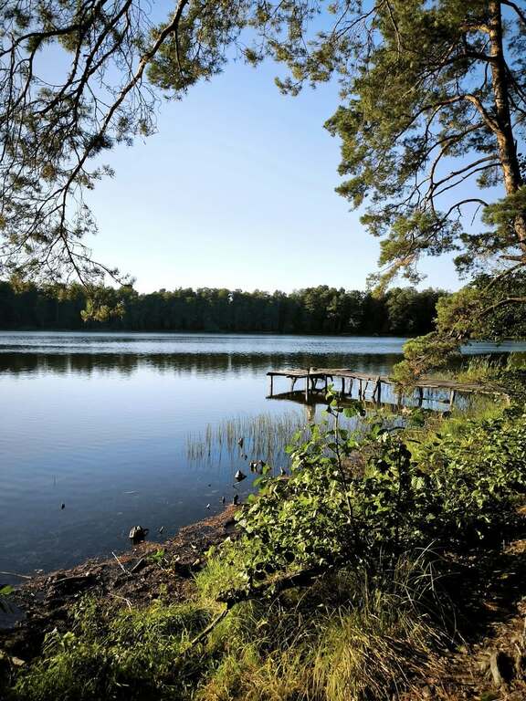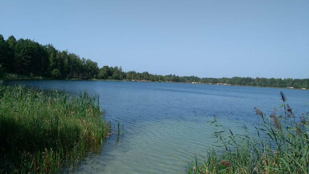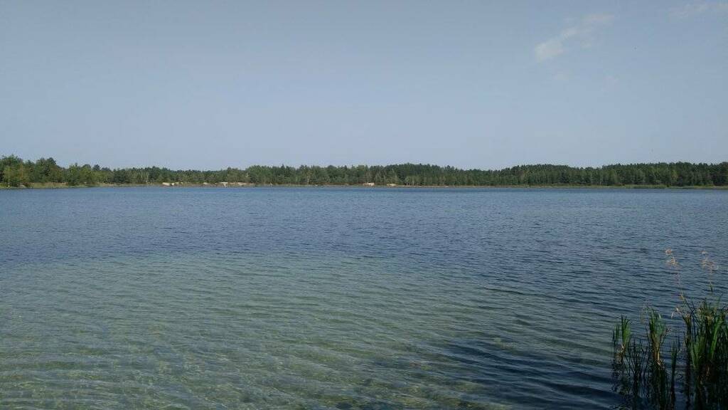 На озеро побудовано багато вимосток, навколо сосновий ліс.