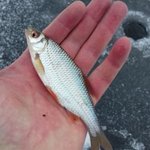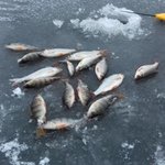 Зранку на льоду вже рибалять товариші. Приєднуюсь до гурту, роблю серію лунок і вперед , на першій лунці окунець жадібно сідає на гачок , і все. Друга, третя лунки глухо, на четвертій проклюнулась плотвичка, веселіше пішло, затихло, переходжу на іншу, а тут окунці в черзі за мотильом. Ось так і час спливає, пора на роботу...