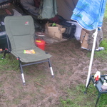 йшов рясний дощик. вирішили перш за все поставити палатку і розвантажитись. між секторами було метрів 100-120, тому лагер поставили посередині. враження по водоймі - круть. велика, гарна водойма, але має один мінусок. берег весь в воді, сплошне місиво, ноги вгрузають вище кісточок. без чобіт там робити немає шо.