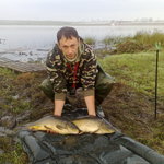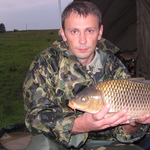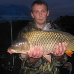 трохи заспокоївшись, примостився біля род-пода готувати прикорм. хвилинок так через п'ять як не ввалить паравозіще, аж пейджер підскочив. в результаті на березі карпуша на 5,9 кг. фотосесія, і назад в воду. далі почалося бурне затишшя. виявилось, шо в моєму фотіку сіли акамулятори і він помахав ручкою. на другий день, правда, позичив батарейки, але їх вистачило тільки на одну фотку. але тут в гру вступає віталік з своїм фотоапаратом і з гучною заявою, що його дочка спеціально для цієї рибалки зарядила акамулятор, тільки фотік чомусь не включається. виявилось, що акум заряжений, але лежить десь вдома... добре хоч телефони заряджені.