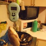 Не встигаєм закусити першу чарку "кави", як у мого колеги по пірсу знову щось дзвонить ... біжимо туди, на цей раз щось солідніше чинить супротив на тому кінці, прийшлось скористатись підсаком, як виявилось це був карп на око десь грам під 900. Цей кльов дещо здивував ... так як на дворі вже глибока осінь, вода досить прохолодна, ночі вже із заморозками, ну дивує, але приємно, ну і нехай ...