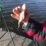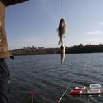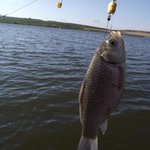 Закидуємо з друзякою по одному спінінгу, та починаємо розкладати інші. Не встигаємо прикрутити катушки на інші, як на першій у друга вже чітка "клювака" і непоганий грамм на 200 карасик у нього в руці.