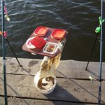 Отже, почали розкладатись .. я вирішив ловити сугубо на дальній заброс. При собі мав декілька спінінгів та один фідер. Поділився із друзям котрі взяли тільки поплавчанки, своїми спінінгами, та залишив собі тільки один спінінг та фідер. Пішов розкладатись на пірс. Пірс зроблений також якісно. Надійний, не хиткий ... молодці. Спочатку розчарувався думаючи а як же із підставками? Але помітив що на пірсі зроблено численні отвори, в середині яких були кілочки ...вийняв одного, підставку просунув, кілочком зажав ... молодці, добре придумали