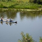 Пропливала біля нас група байдарочників- ми таки до кінця не зрозуміли хто вони, оскільки збившись в кучу трохи нижче по течії вони всі дружно почали купатись голяка