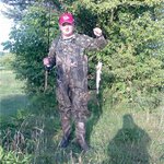 Как то так уже получилось, что сегодня мы с Ув. Сергеем Владимировичем (КУМом) поехали врозь. Я по причине некоторых семейных неурядиц собрался быстро, прихватил с собой своего деда, что бы воздухом подышал на природе и развеялся и....... поехал в Хатынь на Горынь. Из-за сильного ветра в спину первый же мой заброс доставил любовно снаряжённую перед этим силиконовую приманку (сам бы съел, такая ляля получилось) на дерево, растущее на противоположном берегу. Результат -1 приманка, - карбоновый поводок. Ставлю другую, похожую: твистерочек зелень масло 7 гр ушастик. третья проводка соблазняет окунишку. Отпускаем, по причине не достижения им 16 летнего возраста. Ещё несколько проводочек, переход на следующее место. и т. д. В результате на ближней бровке удар, что-то солидное, скорее всего окунь грамм под 400, несколько секунд дрожания спининнга в руках и сход. После ещё два малолетних полосатика. Но мне то щучку хоцца. КУМ своим примером раззадорил, да ещё и дедушка подначивает, что мы мол не ради окуньков с палец сюда припёрлись. Принимаю решение. Одеваю вейдерсы и на ближнюю старицу. Вода прозрачнейшая, вижу всё, что там происходит, очень много малька. Проводки по чистым местам - 0, Попадание под траву +1 малолетний засранец. До встречи в следующем году.
