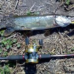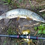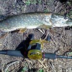 Как оказалось, праздничным выходным решили воспользоваться не только мы, и большинство перспективных точек уже было занято поплавочниками... Как обычно, начал с Baby Buster-a, и через минут 30-40 наконец долгожданная поклёвка - щука на 1,3 кг. Засеклась, как ни странно, за задний тройник самым краешком верхней челюсти, и пока я продирал её через прибрежные заросли, крючок прорвал ей губу и вывалился уже на берегу. Повезло...