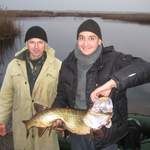 Два дня воскресенье и понедельник рыбачили на Сосно. Погда отличная,не холодно,небольшой ветер,практически не было солнца. Клев к сожалению был слабенький хотя в уловах попадались щуки и 3кг и 4кг и самый крупный трофей за эти дни почти в 6кг!!! В основном троллинг и работали воблеры кислотного цвета,но щука проклевывала и в заброс.С рыбой остались все,но не в большом количестве.Лично я за два дня заработал всего три поклевки,две из них реализованы,щучка в 3.5кг и 4кг.