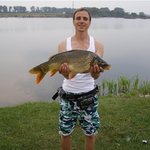 17:05 - дуже гарна покльовочка у мого кума і коропець нам показує, що він так просто до нас в підсак не піде. За першу хвилину він гарненько знущається над фрікціоном і при підтяжці до берега він побачив наші лиця і підсак - як він гарно розвернувся на 180, як він хтів випробувати на міцність снасті мого кума, але все марно - він вже підсакові. Зважування - 3,6кг - я думав, що буде більше.