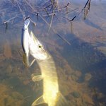 Дув достатньо сильний вітер, тому проводку здійснювати було, м"ягко кажучи, не комфортно. Саме із-за цього фактора наступну покльовку я ледь відчув і, відповідно, запізно підсік, в результаті чого щучка зійшла на перших метрах витягування. Наступної покльовки також довго чекати не прийшлось. Брат-близнець попередніх екземплярів, атакував воблер достатньо далеко від берега і чинив досить сильний супротив при витягуванні.