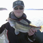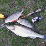 На воду вышли немного позже 8 утра и начали поиск перспективных мест с помощью эхолота. На такой обширной акватории сложно найти судака в первый же выезд, не зная никаких перспективных мест на водоёме, тем более что подавляющая часть дна - ровная и заиленная без всяких аномалий и укрытий. Где там может стоять рыба - совершенно не понятно. Наконец, часа через полтора нашли более-менее интересную точку и начались поклёвки - сначала товарищ поймал неплохого окуня, потом у меня мощная поклёвка на Sawamura OneUp Shad 3 дюйма - поймал судачка на 1,4 кг, позже ещё по окуню у каждого и на этом всё затихло... Проплавали до самого вечера в поисках интересных мест, но рыба себя никак не проявляла. Хотя и погода была просто отличная... А может мы просто не нашли рыбу, или вода всё ещё слишком холодная (утром около 7 градусов, и на удивление мутная) для нормальной активности судака.