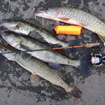 Приехали достаточно рано, но пока без особой спешки накачали лодку и сложили снасти - ближайшую перспективную точку заняла другая лодка. И мы только наблюдали, как рыбак в ней в течение 15 минут достал 3 судака. Мы же до нужного места не добрасывали и не могли стать так, чтобы не мешать ему. Немного покрутились около, но "выход", судя по всему, закончился, и было решено переплыть на другую точку. С первого же заброса на ней ловлю окуня на 4-дюймового силиконового червя, а ещё через пару забросов поклёвка и на том конце шнура уже что-то покрупнее. Думаю, нормальный судак, неплохо давит в дно. К моему удивлению, ближе к лодке "судак" вышел наверх и стал делать свечки. Щука на 1,5 кг, на судачьей точке....