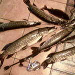 , не сходить, пів хвилини і перша щучка приблизно 1 кг в човні. Зміщуємся ,знову ловлю щучку такуж саму. Переплив в мене знову але легенькій тук на друге копито і мімо. Одразу беру другий спінінг і пробую добити . Тут Батько говорить що шось тягне ,я обертаюсь щоб подивитись і тут і в мене клює -обоє витягуємо по щучці . Після цього в мене ще дві покльвки і ще дві піймані щучкі одна приблизно 2кг