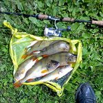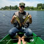 В воскресенье на день рыбака я по приглашению Dgab-а побывал в Млынове. Пока приехал, с утра Петро уже успел нашморгать немного окуней на микроджиг, в том числе и пару приличных. Я вначале поупирался в джерк, но заработал единственный удар на одном из первых забросов, и сразу же сход. Тем временем Петро взял ещё пару небольших окуней на микруху... Солнце уже поднялось высоко и начало припекать, а мы продолжали прощупывать акваторию водохранилища в поисках окуня. На МКД у меня была только одна поклёвка, и та закончилась сходом. Для разнообразия цепляю воблер, и вскоре удар - и на том конце бурное сопротивление. Подтягиваю к лодке - неплохой окунёк, грамм 400-500. Но по моей малоопытности, при попытке втащить его в лодку он всё-таки уходит, обидно.. Продолжаем дальше искать - и вот ещё поклёвки! Наконец мы наткнулись на крупную стаю крупного окуня - уже часам к 12, в самый солнцепёк. Хотя на поверхности никаких следов активности рыбы не было, в течение получаса у Петра практически каждый заброс Daiwa Shiner кислотного цвета заканчивался поклёвкой, хоть и было очень много сходов (часть полосатых разбойников засекались снаружи - видимо, пытались отогнать добычу у конкурентов). У меня в коробке, к сожалению, не оказалось воблёров кислотного цвета с подходящим заглублением (до 1,5 м), а на натуральные расцветки поклёвки были намного реже - у меня работали Berkley Firestick Minnow FS6-S и Strike Pro Magik Minnow 70. Тем не менее - незабываемые ощущения, когда впервые попадаешь на такую стаю, дрожащими от избытка адреналина руками вынимаешь тройники из пасти горбача, делаешь заброс - и через несколько секунд проводки снова чувствуешь мощный удар...