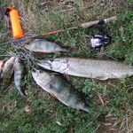 9 августа рыбачил в Млынове. Знакомые за неделю до этого неплохо отловились там по окуню, и была надежда тоже попасть на клёв. Но, как это часто бывает, погода внесла свои коррективы - заметно похолодало, плюс ожидался сильный ветер, возможно будет активной щука. Так и получилось - крупного окуня активного мы так и не нашли, поклёвки были достаточно редкие - у меня только 1 приличный экземпляр на 800 г, и у товарища два поменьше. Зато щука проклюнулась - у меня 1,5 кг на джиг (хорошо, что взяла за край губы и не перекусила флюр) и у товарища немного крупнее на воблер. Окунь завёл в траву и заставил поволноваться, да и вообще дался гораздо труднее, чем щука, хотя и весил в два раза меньше.