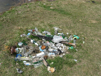 Компанйони: Ярослав Пограничний Погода: слабкий західний вітер, зранку дуже хмарно й холодно(+4°C) Час ловлі: з 06:30 до 11:00 Місце: метрів 30 від дамби, зі сторони поля Зловлено: один окунь Наживка: опариш Прикормка: фішка золота Снасті: фідер Оскільки в суботу небо було чисте від хмаринок, а сонечко пригравало на всі +15, то дуже вже закортіло хоч кудись вирватись до води. Оскільки це було раптове рішення, то вибір впав на найближчий безкоштовний фідерний ставок в селі Козлин. Прибувши на місце ми виявили одинокого рибалку. Цікаво, але рівно рік назад на цьому ж ставочку все було рибалками обліплено і майже не було де сісти. Цей одинак незважаючи на нерестовий період ловив відразу на 4 вудку спутніками. З його зовнішнього виду, купи недопалків цигарок та непорушності бубенчиків на вудках було ясно – кльову нема. Я швиденько замісив прикормку закинув свій фідерок, та фідер для мого напарника і почав чекати на покльовки. Відразу напишу, що за цілий ранок я бачив аж три недопокльовки і одну більш-менш нормальну, яку й зміг реалізувати. Виловив окуня, за допомогою екстрактора вийняв глибоко-засадженого гачка та відпустив плавати далі. Що цікаво, всі покльовки були на мій фідер, а не напарника, різниця між нашими снастями: у мене поводок 0.16, на тому фідері 0.12, у мене асиметрична петелька новенька, на тому фідері – перевірена в боях. Десь в години о восьмій почав підтягуватись рибацький народ і всі по-тихеньку почали чекати на кльов якого тут не було. Кожен зловив по одному карасю(розмір на око від 70 до 140 грам) або зовсім нічого. От ми зовсім нічого Дуже не сподобалось сміття на березі |