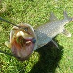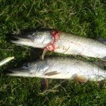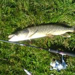Протопали ще кілометрик, отримуючи порізи силікону від дрібненьких щучьок. Плємяш поставив вобік мого виробництва, і на першому ж закиді отримав удар!Фрикцион жужить, а нитка уходить від берега !!!...Короче риба чинила гарний супротив зі свічками --- було на що подивитись. Підвів він рибу до берега і за нитку витяг на берег.