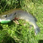 Відразу ставлю і собі свій новенький вобік, закидаю на 20 метрів далі по течії , провожу під самим берегом і теж удар!!! Теж супротив неслабий....теж жужить фрікцион....риба вбивається в берег, в зілля.......підтягую до берега, племінник бере за повідок, піднімає і ..........риба падає назад в воду