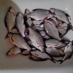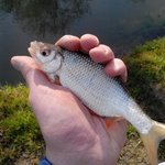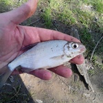 Поруч у батька глухо. За хвилин 10 у нього таке ж саме клювання. Тягне. Відвертаюсь подивитись на свої фідери, чую легке “хі-хі-кання” позаду мене. У батька в руках верховодка, навіть не залікового розміру. “Полетіла” підростати. Дві-три хвилини – знову батько щось тягне. Та сама пісня))) Ще й мабуть менша за першу.