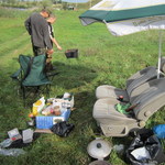 Вроді все вибрали правильно. Оснастки позавозили лодкою, так як поки що не_вистачає практики шпурляти на таку відстань (я про ближню точку. В дальню певно ніхто зі спортсменів не докине). Скажу наперед що ДУЖЕ несподобалось працювати з лодкою саме для завозу снастей, але по іншому там ну ніяк. В 7 вечора в мене спрацьовує сигналізатор. І то такий конкретний паравоз. Був трохи далеко від спінінгів, поки добігав пройшло секунд 10-15 , а фрикціон і надалі тріщав як скажений . Підсік, карп і не думав зупинятись – забрав ще метрів 10 лески. Потім начався шум, гам і багато «розумних» порад як правильно виводити карпа. Позбігалися сусіди які ловили зліва від мене. По їхній мові можна було зрозуміти що вони ловлять коропа ще з пельонок і все про це знають. Результат можна було очікувати – я під пресингом, і кажучи чесно ще ніколи не тримавши на гачку таку рибину, дав їй підійти сильно близько до берега, але в 10 метрах від того місця де стояв напарник з підсаком. Ще було пару спроб підтягнути його до себе, але в риба вкотре рвонулась і зійшла з гачка. Після сходу ще не вмовкали сусіди з їхніми порадами. Сказати що я був дуже засмучений то взагалі нічого не сказати. В мене руки і ноги ще довго трусились, а в голові прокручувався не один раз весь цей спектакль і я все думав що я зробив не так, в чому помилка. Все вказувало на малий гачок, 6-го номеру, який напевно, не достатньо глибоко зачепив карпа, але нічого не міняючи я сідаю в лодку і завожу оснастку знову на те саме місце, прикормивши, як і в попередньому випадку 3-ма шарами макухи і жменькою пелетса. Ловили ми всі дружньо на кукурудзу. (я, наприклад комбінував – 3 зернятка кукурудзи, 2 зернятка і пінопласт або просто 2 зернятка). Повечеряли, пожарили шашличок, зварили ухи (я намікроджижив окунів) і полягали спати. Вночі з годину не давав спати півтолакілограмовий карпик який вчепився сусідам на макушатнік. Вони, після хорошого святкування Дня Незалежності навіть не чули його. Прийшлось будити і допомагати мовчки підсвічувати і спостерігати за діями професіоналів
