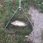 Почало світати і я , розчарований нічною тишиною наших сингалок, почалапав ловити карасика на фідер. Перезакидати карпові оснастки нехотілось через ту саму лодку: це ж знову пливи завозь, шуми, ну його. Закинув фідера і сидів любувався природою. І тут спрацьовує мій сигналізатор на іншій вудці – знову секунд 15 поки добіжав. Він на мить спинився , і о чудо, знову заспівав. Підсік, дав змотати рибині метрів 5 лески і потихеньку БЕЗ СУСІДІВ і паніки почав виважувати. Другий раз , врахувавши свої помилки, я йому майже недав зійти десь вбік. Кричу товаришу і він вже напоготові з підсаком у воді. Та й зі 120 метрів тягнути це не дуже швидко і просто. Хвилин 15 певно тягався я з ним. В голові тільки одне – аби не зійшов як минулий раз, адже гачки я не міняв. Трохи грався фрикціоном біля берега, так як він ніяк не давався підвестись до підсака. Напевно з 4-ї спроби карп опиняється в підсаку і я все ще не можу повірити що він там. Зачепився надійно за бік губи, але все таки малий гачок для нього, я так думаю. З радості пішов будити нашого 3-го колегу, який дуже жалів що все проспав. Навіть не міг оприділити скільки важить, тому що ще таких не ловив. Я дав йому 3 кг, мої напарники 2.5. Сусіди казали ще менше