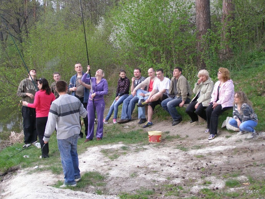 Як і положено у всіх був дуже завзятий настрій, жінки робили канапки, мужики почали колоти дрова.. Ну а я першим ділом замісив прикормку Сам я ловив на фідер, а всім охочим давав свою махову вудку. Майже одразу після закиду я зловив карасика з мізинчик. Така ж риба клювала і під берегом на вудку. Наживака особливого значення не мала, хоча я ловив виключно на опариші. Рибку звісно відразу після виймання з води ми відпускали додомцю Взагалі ми ловили на неправильному ставку. Точніше на ставку де пристойна риба відсутня, тому що цей ставочок спускався півтора роки тому. І я ще окремо напишу розгорнуту статтю про ставки поблизу села Козлин. На фідер я побачив пристойне клювання – підсічка і на тому кінці шнурка відчувається риба(карасикі з пальчик відчувались слабенько), але після 3 секунд схід. Ближче до вечора я все-таки зловив цю рибу: то був коропчик грамів на 100. Мій колега Саша на вудку теж зловив два таких карпики, один з них був грамів може на 200-230. Після нього я теж відзначився. Загалом нами було зловлено 5 карпиків, вага від 100 до 250 грам. Звісно всі були потоплені. Рибалити в оточені колег по роботі досить незвично: всі постійно коментують твої дії, щось радять і безперестанку все обговорюють Що цікаво, крім мене вудку взяла ще одна жіночка, і вона успішно ловила риба майже в ногах. А взагалі рибку з ставочку дістали: керівник відділу виробництва послуги інтернет і КТБ, інженер головної станції, водій, керівник абонентського відділу, водій та секретар. Відзначились всі Відпочили супер. Дуже корисно побачити своїх колег по роботі в не робочій обстановці. Ось наприклад на наступній фотці видно як мої колеги ухиляються від кормушки з повідком при закиданні мною фідера |