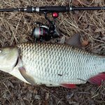 На одній з перспективних точок рівно на фарватері в обратці чіткий щучий "тук", підсічка - є! Риба в'яло але потужно робить протяжки з мотанням головою в глибині, на поверхню виходити не хоче, за секунд 10 таки показується широкий жовтуватий бік з рудими плавцями, ну, думаю щука під 3 кг, судячи з силуету, але підвівши ближче рибину, бачу що то не щука, трішки помучив рибку під берегом з тріском фрикціону, обережно беру лобатого.