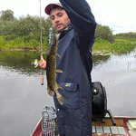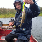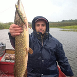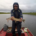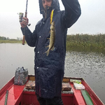 7 вересня. Проснулися о 5 год, сильний дощ не дав зустрiти чарiвний схiд сонця на водi. О 9 ранку вирiшили вийти, попри дощ. Прийняли рiшення рибалити на мiлких заплавах та ближнiх старицях. Рибка вiдзивалася охоче, на перших же перекатах ми почали гарно вiдловлюватися, працював старенький бомбера, копито на офсетi, ще мабуть радяньська незацепляйка....... Дощ не переставав, щей вiтер час вiд часу накривав наш судно, навiть якор не тримав. Але гарний кльов не давав нам iiхати до берега. Помiтили, що зубата охочiше брала на великi мiношки, тому почали експериментувати з нерозловленими та напрацювовути проводки на старих бiйцях. Андрюха непогано розловив та вiдловився пантоновським агароном 140 мм, чим дав надiю на мого агарона правда 125, якого я успiшно розловив 5 щуками, також розловив легендарного орбiта.