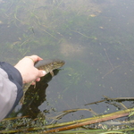 Не меняя приманки, продолжил облавливать яму. Уже почти под конец рыбалки зарабатываю ещё одну поклёвку и без собых усилий и сопротивления достаю из воды шнурка, который немного порвал приманку. Не смотря на это, был отпущен. Мелковат-с…