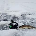 Десь через 1,5 години знову спрацювала одна з жерлиць і в гору піднявся червоний прапорець, підходячи до жерлиці, помічаю. що катушка знову не крутиться, (в голові думка - ну що знов холоста, що це за день такий))). Чекаю одну, дві хвилини, катушка на місці і 1 см не прокрутилась, і ось воно, катушка починає помаленьку крутитися, набираючи обороти, в цей час я роблю підсікання і відчуваю, що зубатка таки засіклася. По супротиву зрозумів, що щука не велика до 1 кг. Хвилинку неквапливого виважування і щука на льоді. Це була моя перша щучка сезону 2018 р.