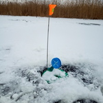 В 07:20 жерлиці розставлені поміж рідким камишом і на чистому плесі, живцем слугував карасик (ті, що дожили до зими, бо купував я їх в жовтні, а зима прийшла в січні).