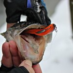 Если ловля происходит на малой реке, данную приманку можно сплавить и по течении ее будет потоком струи нести по реке, под кромки льда заносить там и стоит рыбка, что доказала очередная точка.