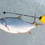До наступления темноты оставалось не более часа, а рыбалка проходила в размеренном темпе без особых успехов. И я решил что-то изменить. Отправился практически к самому берегу и там, на мели, просверлил несколько лунок, расставил удилища и… тут же последовала первая уверенная поклевка. К моему удивлению, снасть согнулась под тяжестью настоящего серебристого слитка. Вот это начало!