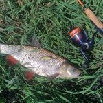 Утром проспал, так что приехал поздно, был с 11 и до 15. Вода в речке низкая и мутная. Клёва почти не было - поймал 3 небольших окуня на вертушку RV-Fishing, на неё же было 3 поклёвки небольших голавлей, но рыба не засекалась. Попробовал несколько воблеров, и на Jackall Chubby Minnow поймал неплохого как для Иквы голавля - 620 г.