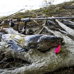 Двое спинингуев и один нахлыстуй облачились в вейдерсы и рванули на нижний перекат, а я остался в лагере возле слива с верхнего бурла. На одном местечке, где струя раздваивалась и огибала остров, была интересная бурлилка с затишком. По границе с затишком начал под разными углами к течению и с разной скоростью ганять кислотного Чабика. Поскольку щуки в тех краях не редкость, а кислотные расцветки это её эрогенная зона