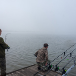 Отже, я рибалив на два фідери на вимостці з Стасом та Іваном, які вже приїхали сюди ще з пятниці. А мої пасажири Сашко з Сергієм рибалили на сусідньому секторі. Ранішня дорога пролетіла так швидко, що о сьомій ранку вже все було закинуто у воду. Зранку був такий туман сильний, що видимість була лише метрів на 50 вперед. Все в молоці.