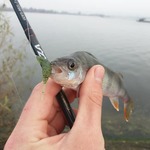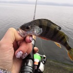 Зранку полосатий проявляв активність на дальній дистанції. Ловив у місці впадіння теплого каналу у водосховище. Течія там доволі сильна і навіть 7г було не достатньо. Під берегом вистачало й одного грама. Але і окуня там було на порядок менше.