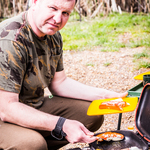 Ближче до обіду прийняли рішення посмажити шашлик з угорського м’яса яке ми придбали в Ашані поблизу Будапешта, поки видно і нема сильної зливи Ваня прийнявся розпалювати вугілля в мангалі який ми привезли з собою, та готувати м’ясо до жарки. Я займався годуванням ближньої точки між двома островами, і час від часу щось фотографував. Під час годування точки о 15.30 починає їхати четверта палка – м'ясо в сторону, карпи атакують. І ми вже стоїмо з палкою та підсаком в руках. Не тривале виважування і дзеркальний короп вагою 12.500 на маті. Посмажити спокійно м'ясо нам так і не вдалося, маніпуляції з рибою на маті, фотосесія намагаючись відзняти якісно та цікаво, зважування, забирають теж не мало часу, який в такому русі летить дуже швидко. Тому всілися ми поїсти близько 17.30, але не до їжі знову їде палка. Приходилося навіть вже ізгалятися, тримаючи прута в руках інший підносив шашлики й на ходу запихав в рот тому хто виважував. Риба в цей проміжок часу була максимально активною, кожні 30 хв. покльовка. Цього дня в нас в перше спрацювала пошукова палка, яку ми прозвали Чингіз Хан. Дані два прута ми закидали ліворуч сектора вільну від лесок і пресингу навмання з великими стіками. Виважування і короп вагою 13.200 на CC Baits Glugged Baits (Spices) з поп апом CC Baits Two-Tone Pop Ups. І в такому темпі вже до сьомої вечора ми мали в активі цієї доби 7 риб, динаміка клювання збільшилася в порівнянні з минулим днем, лишається як мінімум тримати темп.