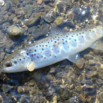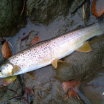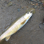 Второй раз ездил уже чисто на рыбалку 22-24 сентября. По приезду речка встретила мутной водой и надежды на хороший клёв сразу пропали. Так и было - быстро проверил пару надёждых точек, где в прошлые разы всегда были поклёвки - никакой активности. Перебирал разные приманки, пока наконец не решил попробовать яркую розовую блесну Даига Banzai 2,5г. Она совсем не для горных речек- быстрое течение не держит, зато заводится при самой минимальной скорости и имеет размашистую игру. Попробовал обловить ею довольно глубокую ямку с замедленным течением, медленно и возле самого дна - есть удар. Через несколько забросов всё же удалось получить нормальную поклёвку и поймать первую форельку, обрадовался что подобрал приманку даже под такую пассивную рыбу и мутную воду. До вечера вымучил три рыбы, плюс несколько сходов и до десятка выходов и холостых поклёвок. На такую пассивную рыбу я ещё не попадал, чтобы она хоть как-то отреагировала на приманку необходимо было провести её буквально под самым носом. И то часто форель только выскакивала за блесной из укрытия, но даже не всегда атаковала.