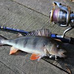 Окунь ударил с выброса и как судак прижал бородой, весьма не обычная поклевка.