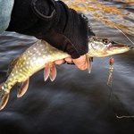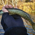 година, друга... зверху почало припікати сонечко. Так як крупняк вперто мовчав вирішив, хоча б посмикати окунців. Почав обкидувати береги в пошуках зграї полосатих розбійників. Ближче до обіду у самого краю берега з під гілля впіймався здоровенний щук))