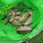 Вирішили з кумом половити трохи на платному ставку, бо на Стиру щось сумно стало цього сезону. Не довго думали куди поїхати, обрали Боголюби тому що близько і дешево враховуючи теперішні ціни на інших ставках. Як приїхали то зрозуміли, що виїжати треба ще раніше, нам просто пощастило що було ще два місця, бо якби поїхали далі шукати то вже б було зайнято. Я вирішив попробувати на фідер та "смерть карася" половити. Ну а кум теж на "смерть карася" та звичайну донку, плюс для забави закинули поплавок. Зранку десь приблизно до 9:00 нічого не брало, хоча сусід ловив. Після пійманої першої рибки на пружину я вирішив зняти фідерну кормушку і почепити пружину (смерть карася). Діло пішло, почерзі почали дзвонити дзвоники на кожній вудці. Я наживляв опариш і пуф (комбінував по різному), кум грався мотильом і опаришом. На поплавок з мотильом, теж клювало. Причому зранечку на дальній дистанції, ближче до обіду вже майже під берегом. Карасики були більш-меньш одного розміру, десь на долонь, трохи менше. Маленьких не було. В загальному нам сподобалось. Згадали, як то було колись коли в сусіда дзвенить "колокольчик" а ти широко відкритими очима дивишся чи то бува не твої дзвенять.