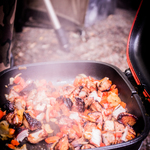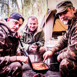 Після клювань по при постійні вже нагадування Вані що він голодний, ми все ж таки вирішили поснідати об 14-15.00. З залишків вчорашнього шашлика, яєць, кетчупа домашнього (який теж прихватив без відома тещі — Іван) ми зробили шакшуку, якою і поснідали й побобідали заодно. А вудилища все мовчать. Сонце зайшло за горизонт, а вудилище продовжували мовчати. Настала черга вже нашої коронної страви на рибалці– «Гарячої сковорідки від «Рівнян»», страва на стільки проста, але займає досить багато часу, бо готується на відкритому вогні, і в приготуванні досить важливо дотримуватися поетапності прожарювання інгредієнтів, але час витрачений на її приготування того вартий. В результаті повна сковорідка смачної вечері, яка ще лишилася і на сніданок, а сигналізатори продовжували мовчати.