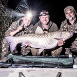 Після смачної вечері я відразу пішов спати, хоча і черга виважувати була моя. І не встиг я прилягти, як у 22.05 почув звук сигналізатора – один пік від берега, потім свінгер трохи провис, я не підсікаю і чекаю продовження, щоб зрозуміти що буде робити риб далі, йти до берега і опускати свінгер чи навпаки – стартувати від берега. І тільки побачивши, як свінгер підіймається і сигналізатор набирає своїх обертів, я підсік. Риба спочатку дала про себе знати, що засіклася, але розвернулася і пішла до берега і я потроху в натяжку підмотував її до берега, вже десь на середині шляху риба заплутала одне вудилище на декілька витків навколо сусідньої ліски, тому довелося послабити фрикціон, щоб розплутати ліски між собою, як на диво риб поводився спокійно і стояв на місці, але ми поки не розуміли та не бачили, що то за риба. Розплутавши ліски я почав виважувати далі й вже ближче до берега риба почала показувати свій характер, трохи згодом піднявши рибу на поверхню ми помітили що то амур, на око близько 15 кг. Ще біля берега декілька раз йому вдалося стартанути, вистрибуючи з води, але я тримав його на відпущеному фрикціоні притримуючи шпулю рукою, щоб при ривку риби відразу пустити її і дати змотувати без супротиву ліску. І десь за другим разом ми завели рибу в підсак, де під час саме моменту заходу риби в голову підсаку я помітив, що він туди заходить з трудом. Я зловив себе на думці, можливо то саме та «арапайма», яка приснилася Вані. Вже потім, коли ми всі видихнули та заглянули в той підсак, то побачили амура, якого до цього часу ще ніколи не ловили, підняти його було вкрай важко, тому ми скористалися сумкою для зважування, щоб завести рибу разом з підсаком, підіймали у двох з Олегом. І коли поклали рибу на мат побачили його у всій величині й красі – то був амур, який ледь влазив в нашу сумку «слінг» довжиною на весь «шумбарський мат».