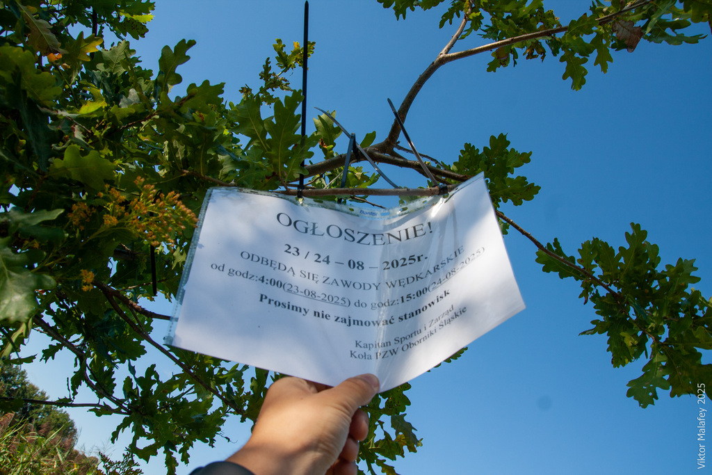 Поки я чекав на свого компаньйона, що мав мені привезти роздруковану ліцензію на вилов риби zezwolenie wędkarskie, то прийшовся по берегу попитати як в інших рибалок з кльовом. Виявилось, що кльову немає вже три дні так точно. Жодного ляща, клює дрібнота. Також нас попередили, що тут будуть змагання й річка буде закрита для любителів, пізніше я знайшов ці оголошення прикріплені до гілок дерев.