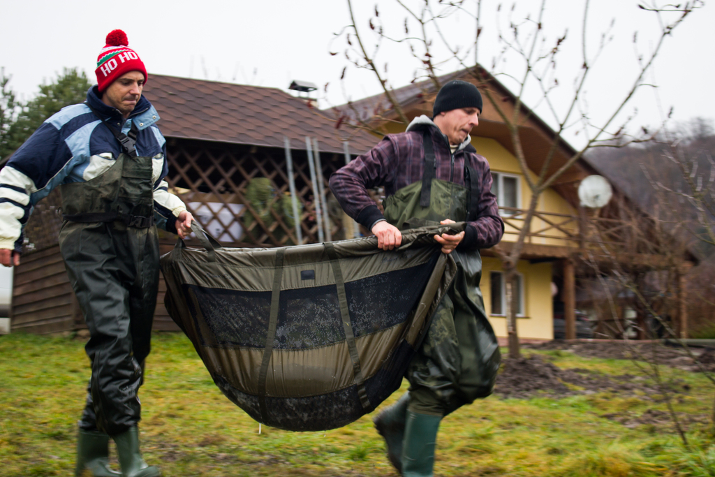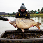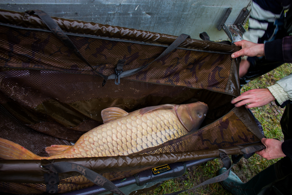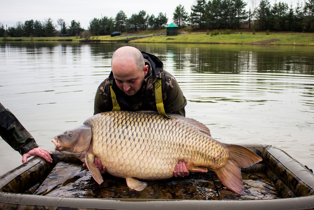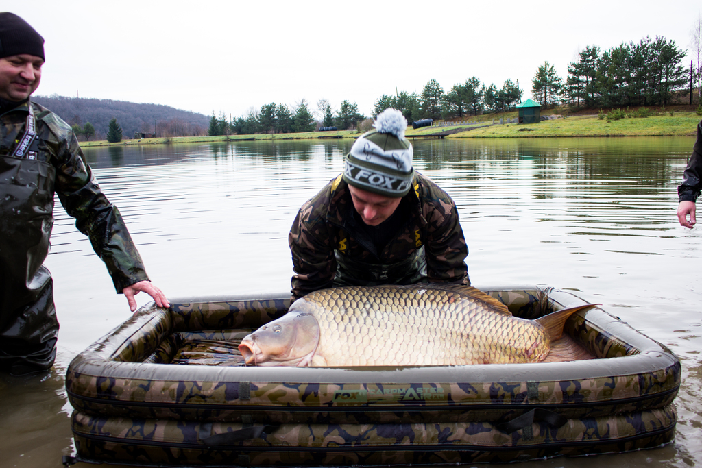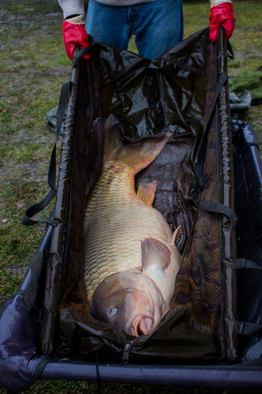 Весь процес рухався доволі спокійно та відпрацьовано – кожен виконував свою роботу, лише поодинокі вигуки Володі: - «Юхууууу!» сигналізували про те, що команда приготуватися, цього разу буде «Мега Конь»!!! Але даний випадок кардинально відрізнявся від всіх попередніх. Ми стоїмо у воді в очікуванні наступного коропа, якого мали принести хлопці в слінгу. А тут якась непритаманна їм суцільна метушня, ми оглядаємося, а та вся купа людей як ті мурахи щось там копошаця біля машини та мата який стояв поряд. І бачу як Володя який завжди знаходився на початках біля резервуара з рибою і згодом в самому резервуарі де відловлював кожну рибку окремо – бачу як він злазить з машини для того, щоб допомогти нести рибу – за два зариблення такого я ні разу не бачив. Я розумію що щось велике, вилажу з води та біжу до них, і в мене викотилися очі, а щелепа «десь лежала на землі» від побаченого. В короповому маті який видавав невідомі до цього мені звуки хрусту від навантаження на нього – лежав ВІН!!! (те заради чого хлопці хотіли, щоб ми повернулися на друге зариблення). Риба своїми габаритами заповнила як по величині, так і по глибині весь мат, я такої величини риби не бачив в очі ніде. Дуже швидко і мега акуратно рибу в слінгу починаємо нести до зважування (тут навіть по при те, що Володя і ще троє хлопців несли та підтримували sling з рибою, де від машини й до помосту було не так вже й далеко, я всі ті пару метрів контролював і переживав, щоб все акуратно зробили, бо слінг так тріщав і я думав що ось-ось і він розійдеться по швах) – такого хрусту я ніколи не чув.