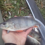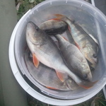 13:40 починаємо ловити. В місці лову глибина 4-5 м і чисте дно. Змінивши дві точки так і не отримали покльовки. Надії хоч щось зловити вже майже не має. Але перемістившись на 3-ю точку, на 2 проводці отримую покльовочку і відчуваю, що рибуля на гачку, взяла вона на тойже кейтеч Шад Імпакт 2". Далі змінюю насадку на Крейзі фіш Поларіс 3" і отримую ще десь 7-8 покльовок з яких 3 реалізованні у вигляді окунців в районі 120-230 грм.